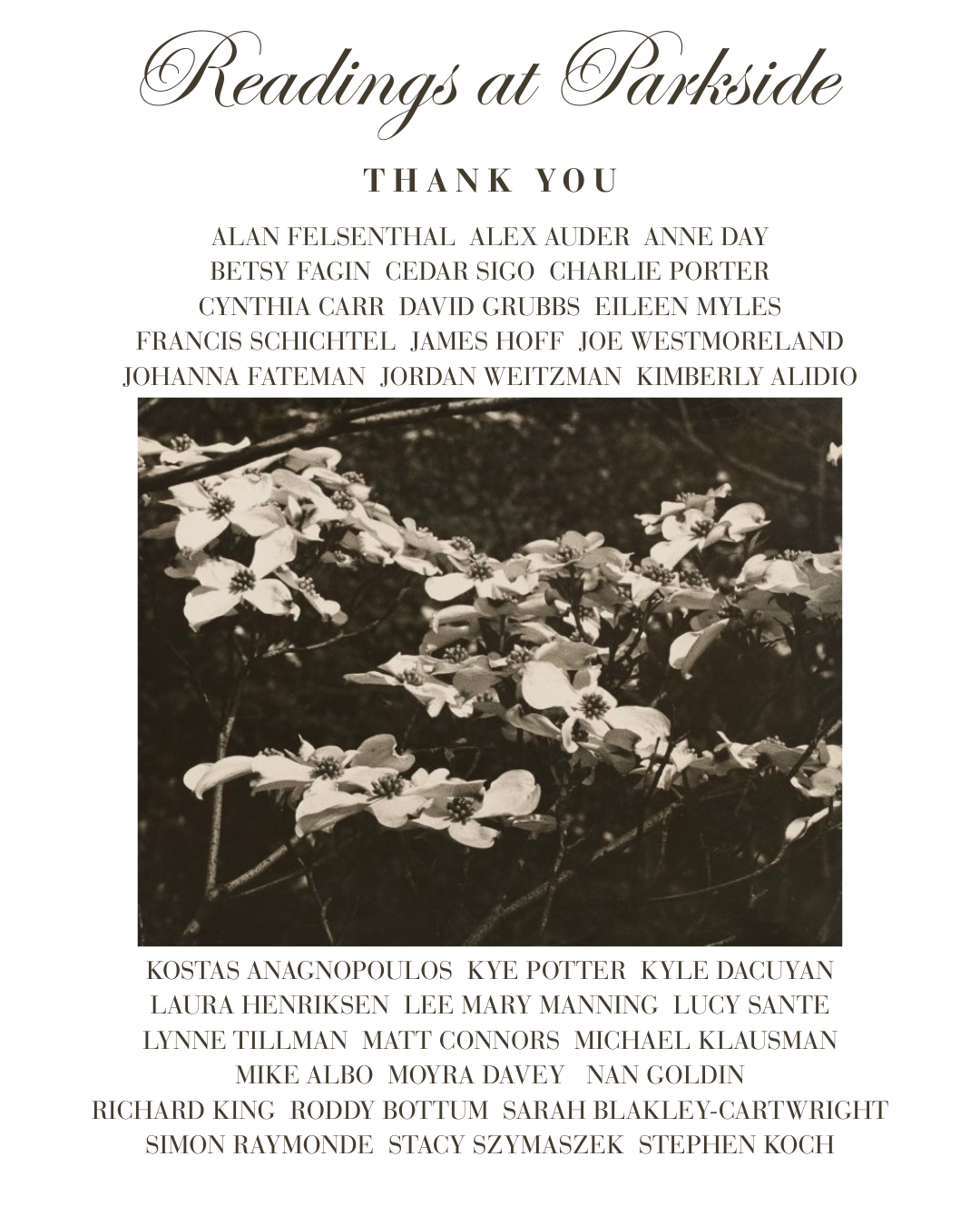 As we look ahead to 2026, READINGS AT PARKSIDE would like to take a moment to celebrate and express our gratitude for the amazing community of artists, writers, thinkers, publishers & booksellers who make everything possible — as well as all the Parkside proprietors (I love you), bartenders, sound and lighting techs, people spreading the word, friends helping out, people supporting, people creating community, people getting us through — and every single person who came to a reading, or multiple readings, or who hopes to in the future. We have had an unbelievable year and this was only possible through your support! We have so much stellar programming that we hope to manifest in 2026 — your support will help make this possible. We are so grateful to the Fire Island Artist residency (FIAR) for their continued fiscal sponsorship!